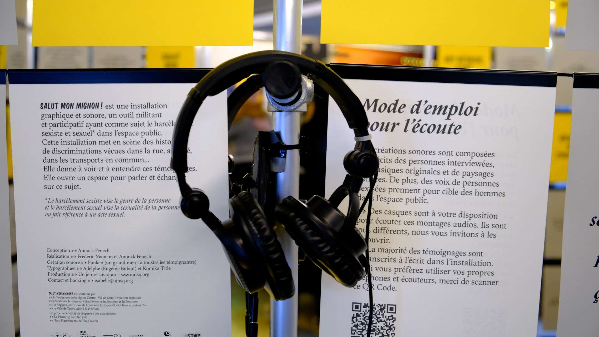 "Dans le hall du Temps Machine, il y a tout juste un mois, on pouvait trouver une structure, une cage de papiers gris et jaunes, sur laquelle figure des extraits de vrais témoignages mais aussi des interjections aux rôles renversés où le féminin laisse la place au masculin. Autour, des casques sont mis à disposition, avec ces mêmes témoignages et phrases sous forme de jingles et, en fond, une nappe sonore créée par Funken.